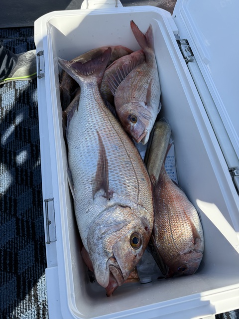 どうも、船上カメラマンです(`・ω・́)ゞ🎣 本日はお客様2名と真鯛釣りで出船いたしました⚓️ 序盤からポツポツと真鯛の姿が見え、最大2.6kgを頭に計8枚✨ 良型アコウ、ガラも混ざり、クーラーの中は色鮮やかに!🎨 途中には惜しいバラシもあり、最後の最後にドラマチックな大アタリ──!!️ 「これは大鯛か!?」と思いきや、正体はまさかのエイ😓💦 船上は笑いとため息が入り混じるフィナーレでした😂 風強い中、本日も最後までお疲れ様でした(`・ω・́)ゞ✨